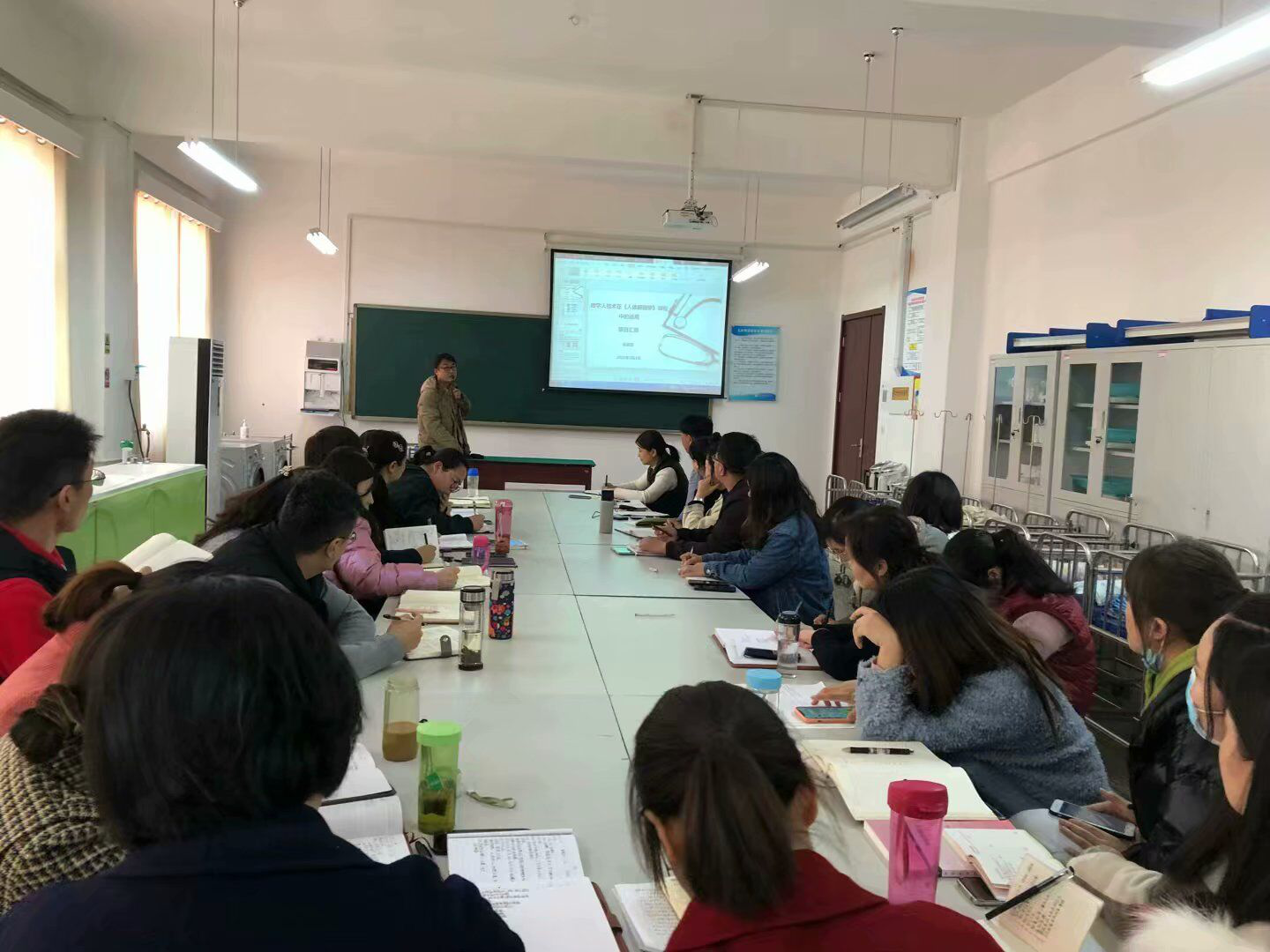 随后,基础教研室主任李俊艳老师上台分享,她分别从思政融入专业课的重要意义,如何在专业课中融入思政元素,以及课程思政效果的探索与思考三个方面,结合本教研室课程思政实施情况、参赛经验等进行了经验交流和分享。全体教师深深体会到,身为医学专业的教师,课程思政对我们授课教育学生的意义则更加重要。