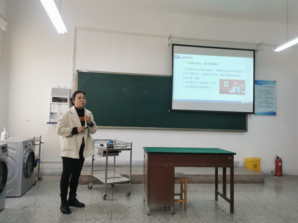 最后,身为实训室管理员的屈婷婷老师向大家分享了“实训室安全管理”的学习体会,全院每一位老师们又重温了安全教育的问题,也能认识到安全面前无小事。我们要确保实验室管理“三不伤害原则”--—不伤害自己、二不伤害别人、三不被别人伤害,保证实训课授课质量的同时,确保师生的生命安全。