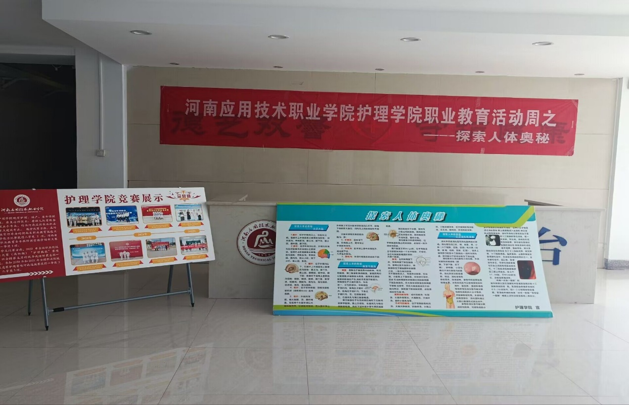 为响应milan米兰体育官网2023年职业教育活动周主题“技能,让生活更美好”,2023年5月16日,护理学院外科护理教研室利用校园宣传栏阵地在D楼一楼大厅、中国数字人虚拟仿真实训室等场所,通过张贴职业教育相关条幅、展板,中国数字人系统、AR和VR实训基地亲身体验等途径,围着“探索人体的奥秘”开展了丰富多彩的宣传活动。营造了人人知晓、人人参与的浓厚氛围,为护理学院及其他学院师生普及人体健康知识。