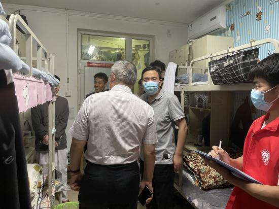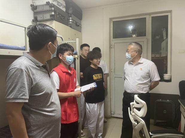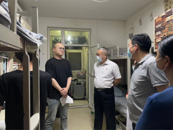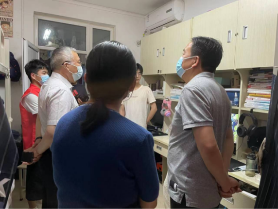 朱东方书记走进5号楼宿舍,和学生进行认真细致交流,详细听取疫情防控下学生的需求,同时深入了解学院教育教学、师生精神面貌和心理状态及疫情防控工作落实情况。朱东方书记指出要深刻认识当前疫情防控面临的严峻形势,要严格执行学校疫情防控各项要求,保持宿舍整洁卫生,每日通风消毒,科学规范佩戴口罩,勉励学生振奋精神、坚定信心、防控履责、携手前行,同时嘱咐学院负责人及辅导员要认真做好线上教学、学生生活保障和心理疏导等工作。