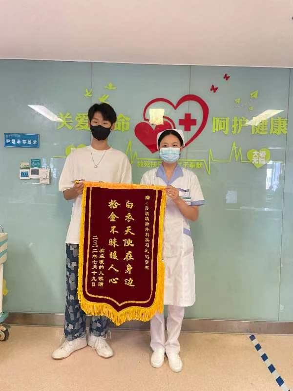 一名优秀的护士不仅需要扎实的专业知识及专业技能,更要有良好的思想品德素质。冯新茹同学在一次下班路上捡到一部手机,她在炎炎夏日下原地等候半个多小时,最终将手机交还给失主,失主拿到手机后为对冯新茹的举动表示感动,送锦旗一面以表感谢!