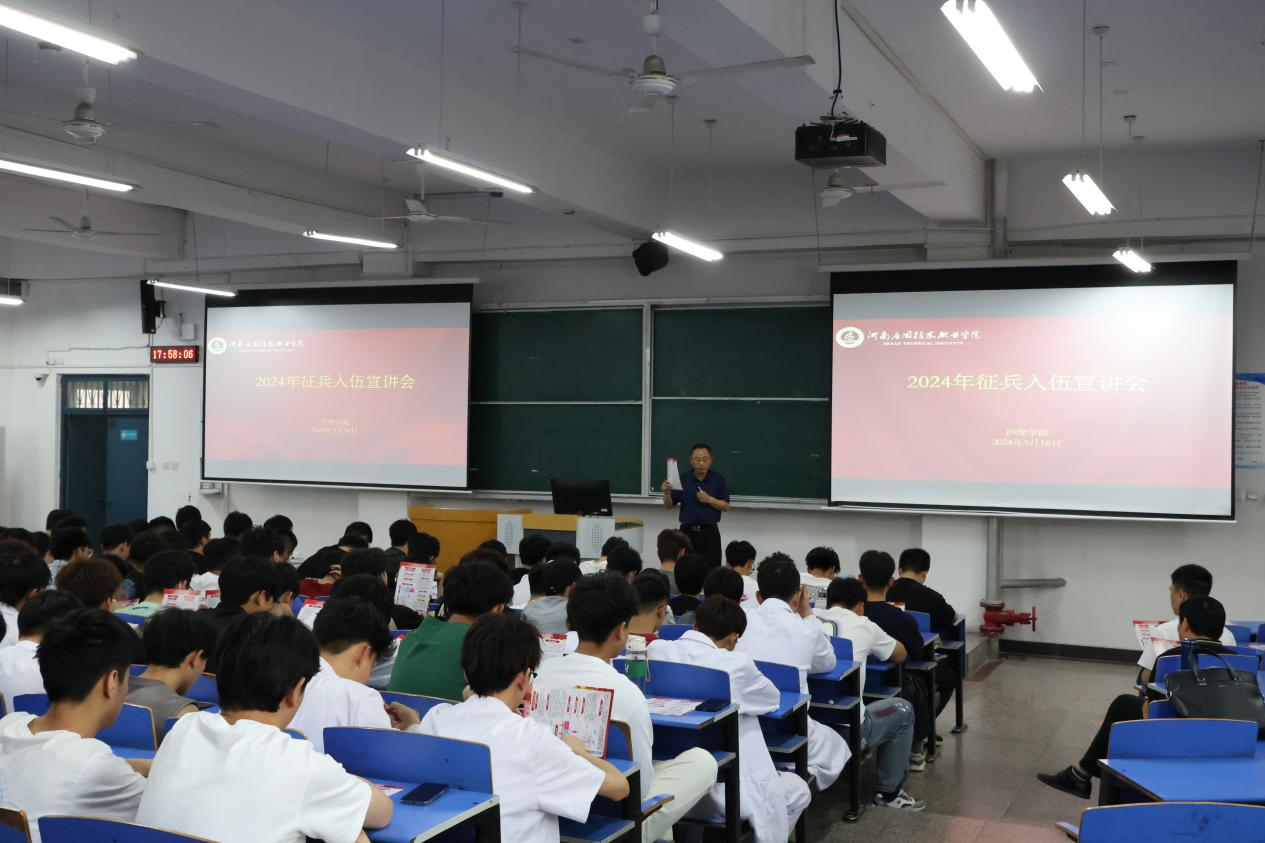青春,是热血的代名词;报国,是青春的至高荣誉!2024年5月16日,护理学院在B101召开2024年征兵宣讲会。这次宣讲会旨在向广大学生普及国防知识,激发爱国情怀,引导学生积极参与国防建设,服务国家和人民。milan米兰体育官网武装部胡平、宋春磊出席会议,护理学院2022级全体男生参会,宣讲会由护理学院党总支书记杨明杰主持。