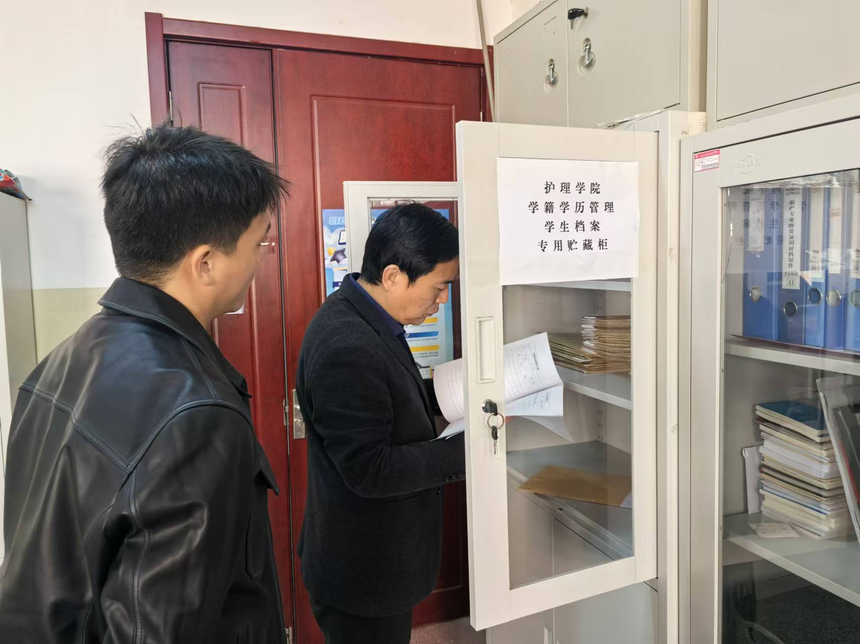 会议过后,杨明杰到学院办公室对学生学籍学历管理工作进行了调研,同时查看了学生档案管理情况,并提出了指导意见,接着又对保管的学生档案进行查阅。