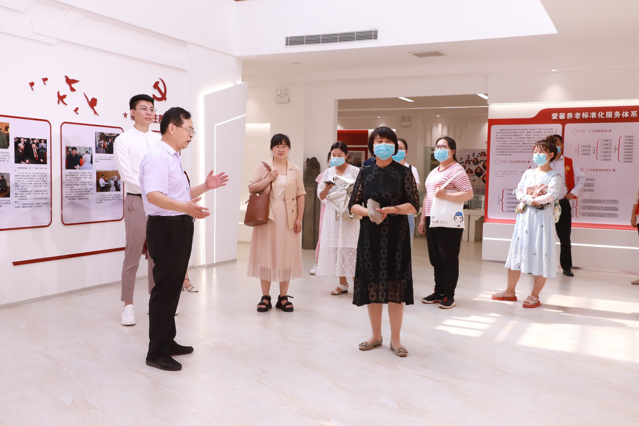 首先大家来到爱馨敬老文化展览馆参观,受到集团党支部副书记马学才、副总卢以轩等工作人员的热情接待。马书记为大家讲解了爱馨党建工作和企业文化建设、集团的的两个“三六九”体系(即标准化服务体系的三位一体、六大标准、九种需求与教育培训体系的三心、六智慧、九种能力),这与milan米兰体育官网对老年保健与管理专业学生的培养理念、及专业人才的重视程度高度统一。