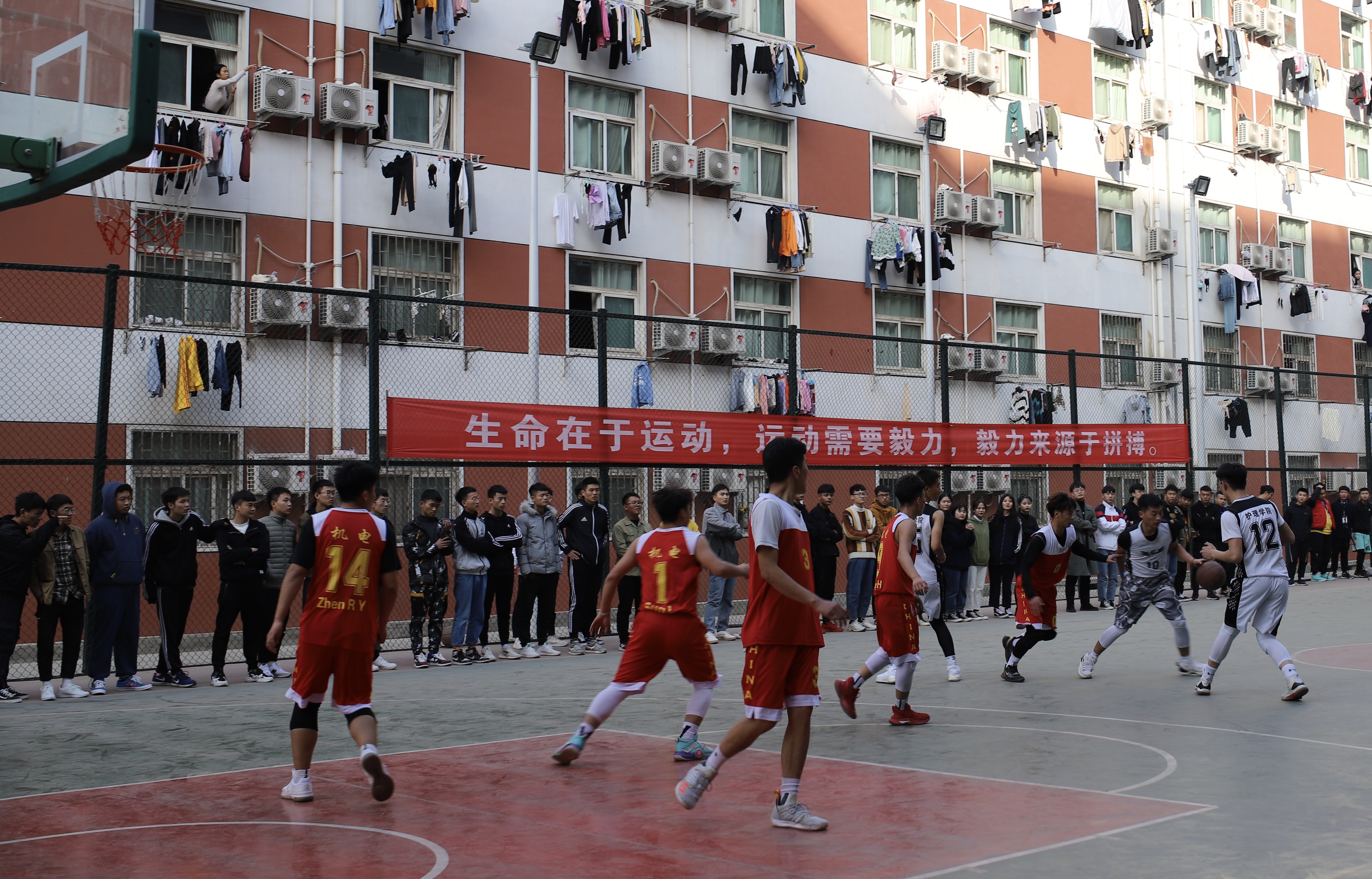 本次篮球总决赛护理学院由刘思阳老师负责组织护理学院篮球队进行赛场战术制定,下午2:10,比赛开始,精神抖擞的双方队员们摆开姿势,开始激烈的抢球,断球,防守,进攻模式,场下拉拉队也情绪饱满的为运动员加油助威。在这场强强对话的决赛上,为了最终的冠军,双方球队在球场上拼尽了全力,拼出了水平,打的精彩无比、激烈异常。身着红色队服的机电学院篮球队在第一节利用小节奏进攻优势一度领先,但护理学院篮球队也积极应变,迅速调整,双方比分交替上升,悬念保留到了比赛最后一刻,最终,护理学院在篮球总决赛中惜败机电学院,荣获本次球类运动会篮球第二名,虽然没有夺得冠军,但护理学院篮球队在场上全身心投入,拼搏至最后一刻的表现给全场观众演绎出了宝贵的团队合作精神和护理风采。