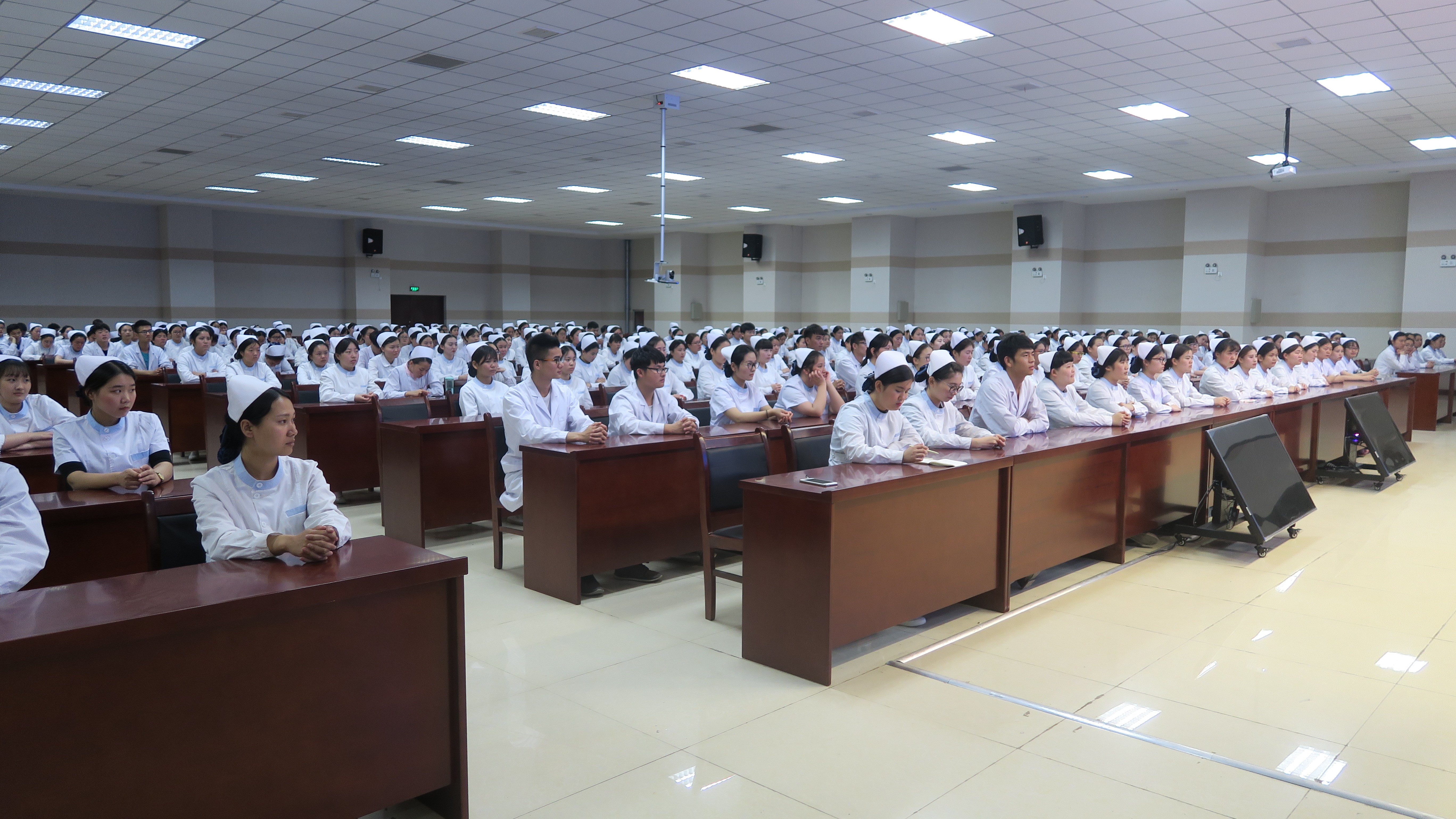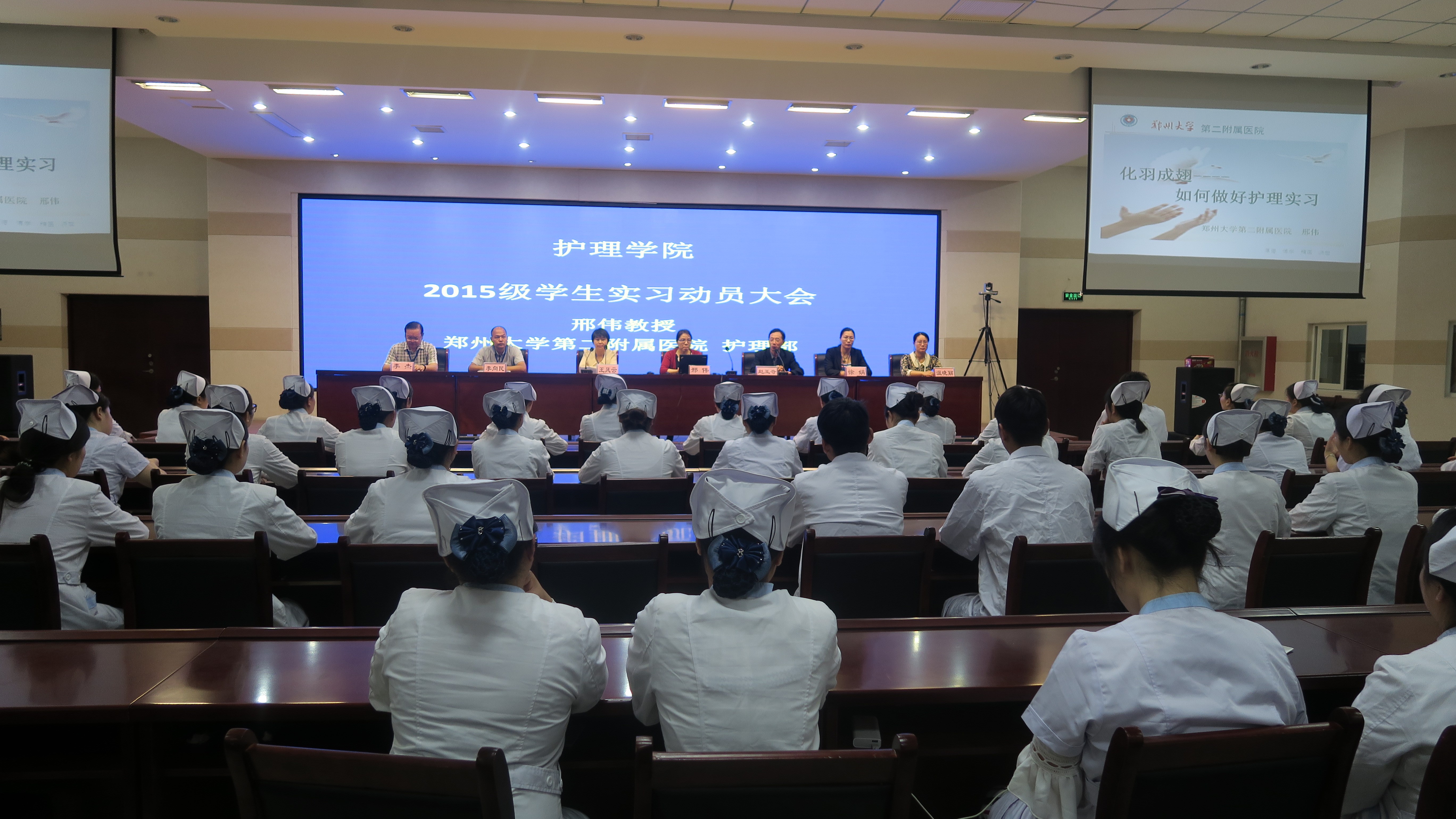2017年5月8日晚上19:00,我院聘请郑州大学第二附属医院护理部副主任邢伟教授在实训大楼二楼会议室为2015级护理专业举行实习动员大会。副校长赵玉奇、教务处副处长李杰、护理学院书记徐娟、就业指导办李向民主任,副院长温晓丽出席会议,护理学院15级班级辅导员及全体实习学生参加了动员大会。大会由护理学院王风云院长主持。