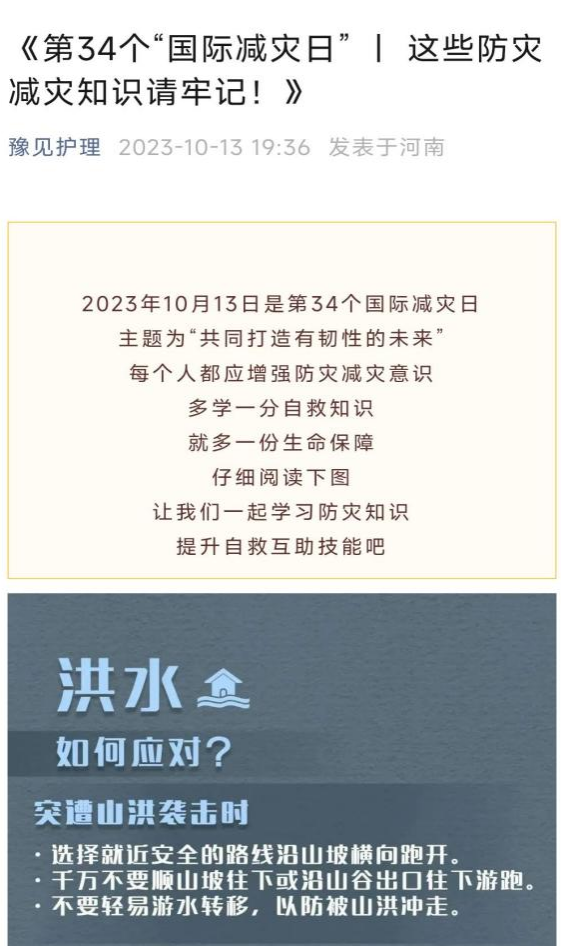 2023年10月13日是第34个“国际减灾日”,护理学院为引导全体师生牢固树立风险意识,提高化解灾害风险能力,组织开展了“减轻灾害风险,守护美好家园”的10.13防灾减灾主题教育宣传活动。