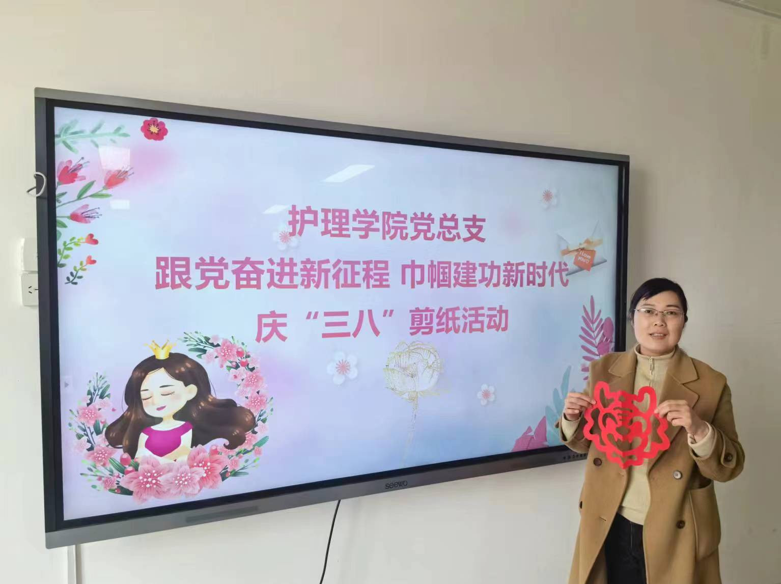 三月春晖争芳菲,巾帼花开别样红。为庆祝“三八”国际劳动妇女节,丰富教职工课余文化生活,营造温馨和谐的校园氛围,3月12日,护理学院分工会举办“跟党奋进新征程 巾帼建功新时代”庆“三八”剪纸活动。党总支书记杨明杰主持并为学院女教工送上了节日的问候和美好的祝福。