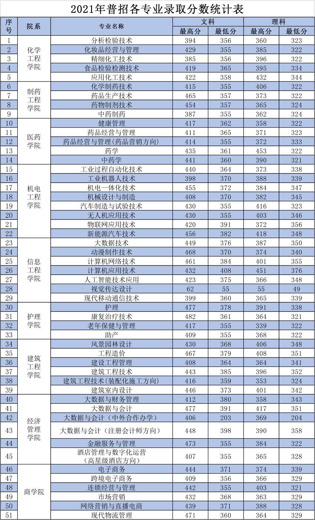 2021年普招各专业录取分数统计表